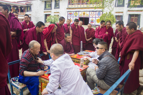 義診現(xiàn)場,醫(yī)療隊(duì)熱情接待每一位前來就診或咨詢的僧侶,為其看病、發(fā)放藥品及講解日常健康知識(shí)和自我保健的方法,僧侶們也由一開始的只是駐足觀望轉(zhuǎn)為積極上前就診,并主動(dòng)向醫(yī)療隊(duì)闡述自己的病狀,同時(shí)針灸科李泉濤醫(yī)生更是不間斷地為多位經(jīng)常久坐寺中的僧侶推拿與按摩頸、肩、腰、腿等各個(gè)部位。中午時(shí)分,醫(yī)療隊(duì)還受邀與僧侶們一起吃齋飯。
