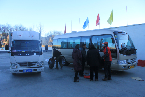 19日清晨7時,滿載物資的貨車本應(yīng)準時從拉薩市出發(fā),前往日喀則目的地,但剛準備出發(fā),我們的貨車卻因天氣寒冷,在香格里拉酒店的坡道上熄火。天氣太冷,發(fā)動機打不著火,這可急壞了大家伙,當(dāng)下,大家紛紛下車,一起推車。所幸,最終貨車重新啟動!可在汽車行駛至拉薩機場附近時,我們的客車又被利物刺破了前輪,并且由于天色尚早,附近的幾處修理廠皆是大門緊閉,尚未開門,好在加油站的工作人員替我們打了電話,找來了一位修車師傅!