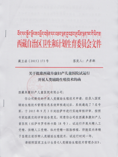 關(guān)于批準(zhǔn)西藏阜康婦產(chǎn)兒童醫(yī)院試運(yùn)營(yíng)開展人類輔助生殖技術(shù)的函