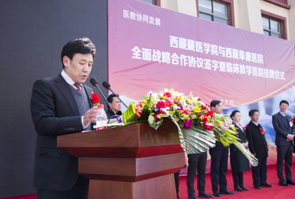 隨后,王斌董事長(zhǎng)在儀式中發(fā)表講話,全面介紹了西藏藏醫(yī)學(xué)院及西藏阜康醫(yī)院的發(fā)展歷程,并表示西藏藏醫(yī)學(xué)院和西藏阜康醫(yī)院達(dá)成全面戰(zhàn)略合作,旨在進(jìn)一步加強(qiáng)雙方戰(zhàn)略合作關(guān)系,雙方將在良好的合作和互信基礎(chǔ)上,本著“優(yōu)勢(shì)互補(bǔ)、資源共享、互惠互利、合作共贏”的原則,重點(diǎn)在人才培養(yǎng)、科學(xué)研究、學(xué)科建設(shè)、醫(yī)療服務(wù)等方面開(kāi)展長(zhǎng)期合作,提升雙方在醫(yī)療、科研、人才培養(yǎng)及社會(huì)服務(wù)等方面的綜合水平;王斌董事長(zhǎng)還表示,為培養(yǎng)應(yīng)用型醫(yī)學(xué)人才,西藏阜康醫(yī)院特在西藏藏醫(yī)學(xué)院設(shè)立了30萬(wàn)元助學(xué)、助教基金,用于幫助學(xué)習(xí)優(yōu)秀卻又家境貧寒的莘莘學(xué)子和鼓勵(lì)辛勤耕耘的優(yōu)秀教師。